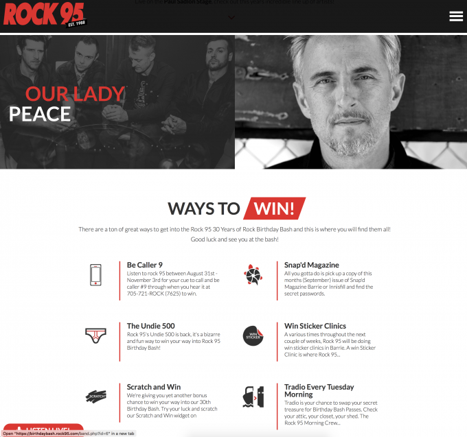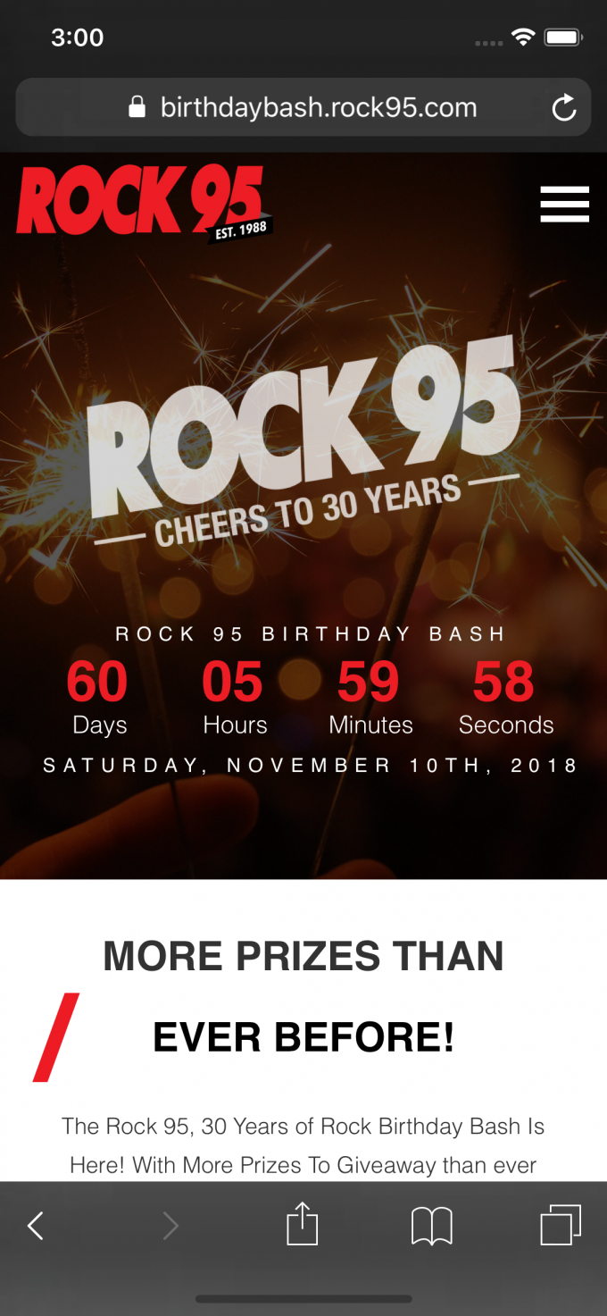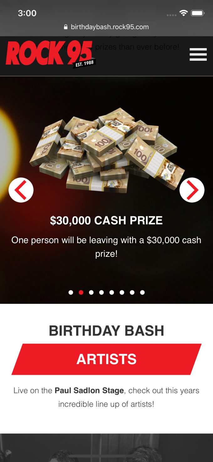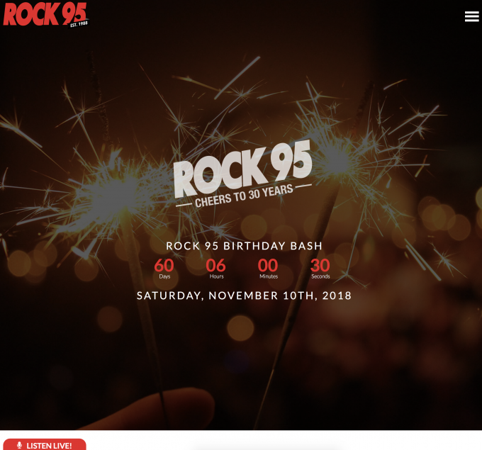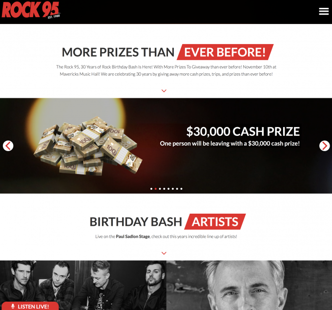This year marks the 30th for Rock 95, Central Ontario's number one rock station. In celebration of their biggest birthday bash event we created a sick site which makes it easy for fans to find out about the event, how to win tickets, explore the prizes being won and the artists. Of course we paid tribute to past bashes with a cool history timeline of performers at past bashes and more.