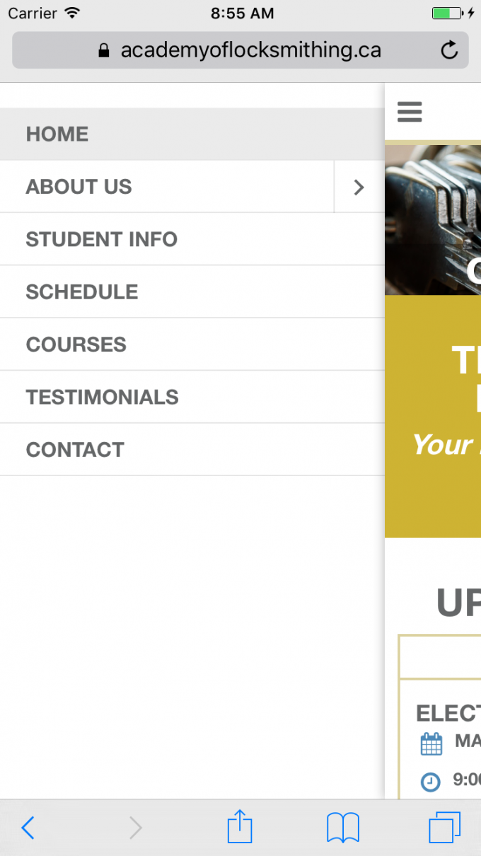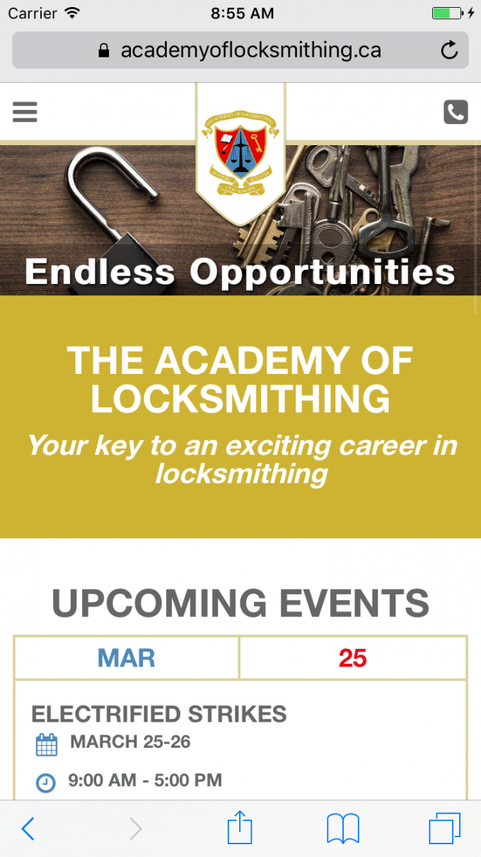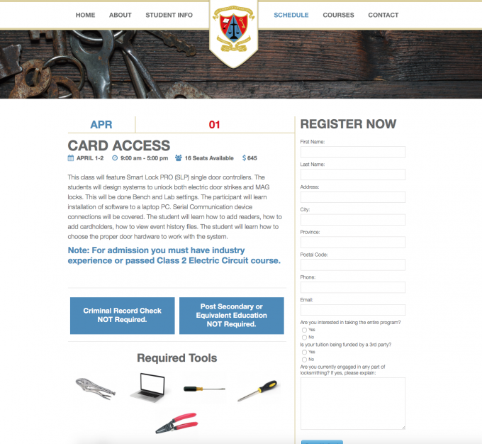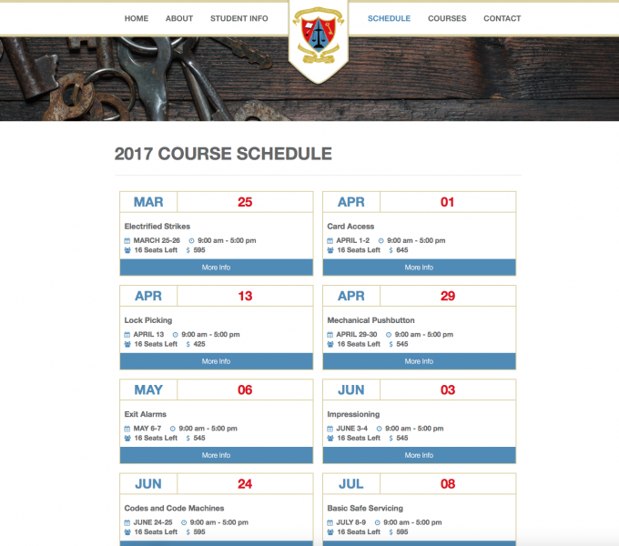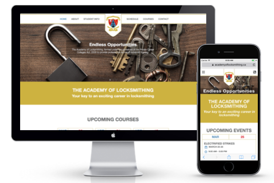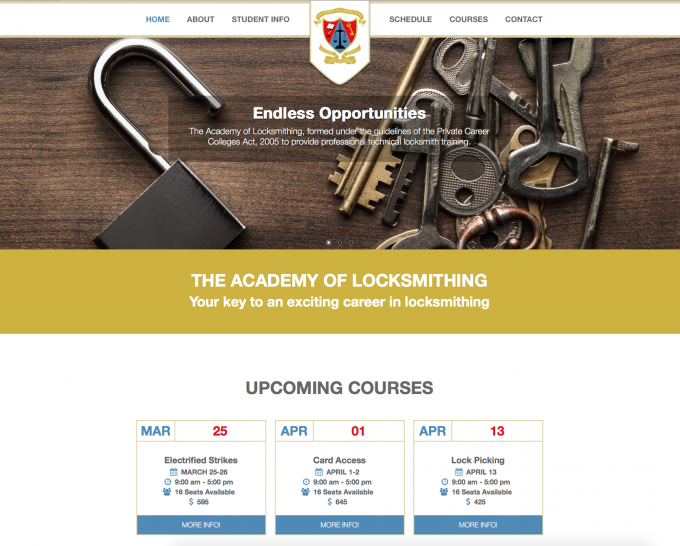 This locksmithing school needed an easy to manage and attractive website for communicating program details and course dates. Here we created an incredibily easy to use custom website design that allows prospective students to learn about the programs they offer and explore course dates through an intuative navigation.