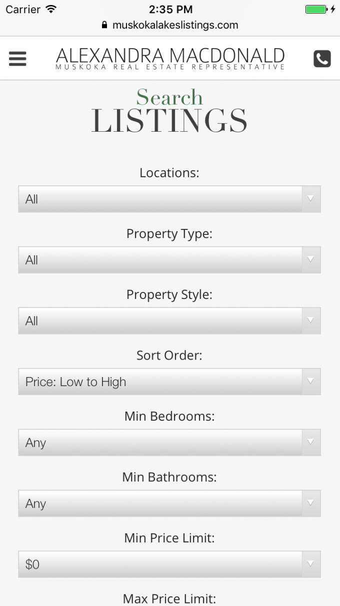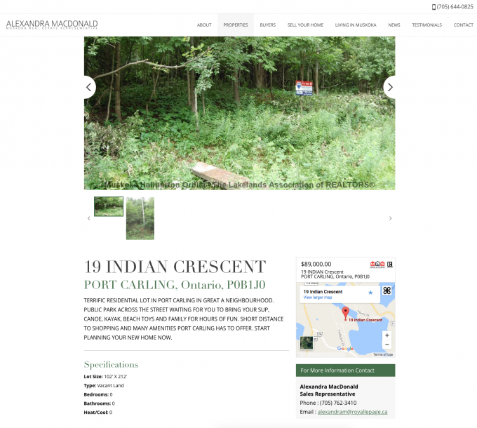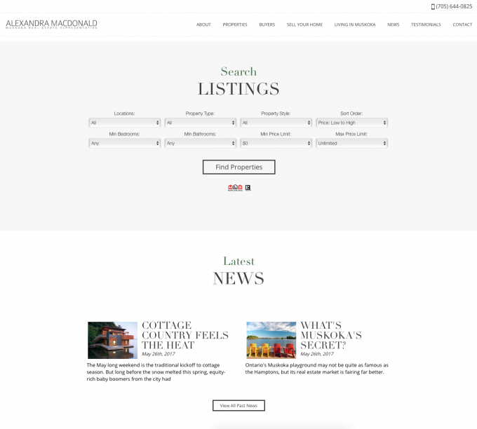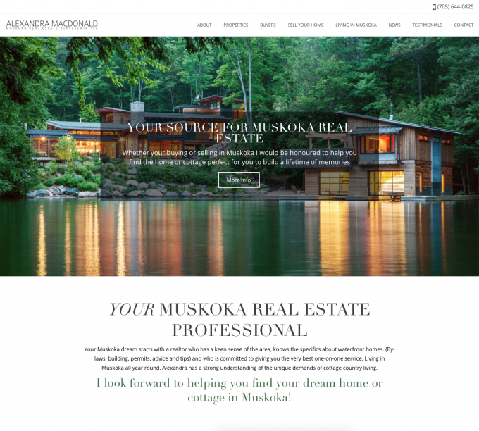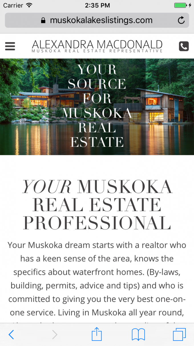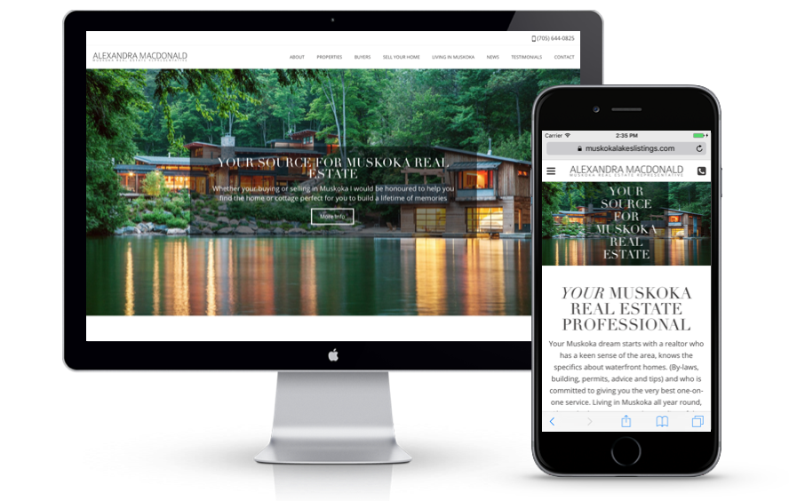 Type to enter textThis up and coming real estate agent in Muskoka's famous cottage country needed a professional, modern website to promote her brand and provide easy access to search local listings through her website. All of the listing information is fed directly to the website by Realtor.ca's database to ensure her listing information is up to date and management free!