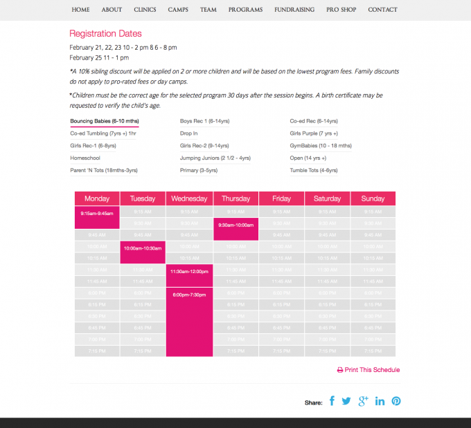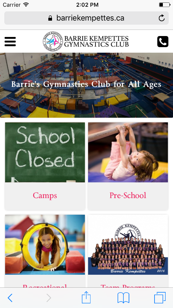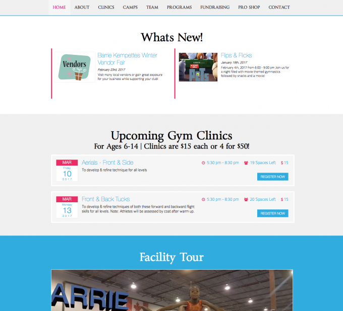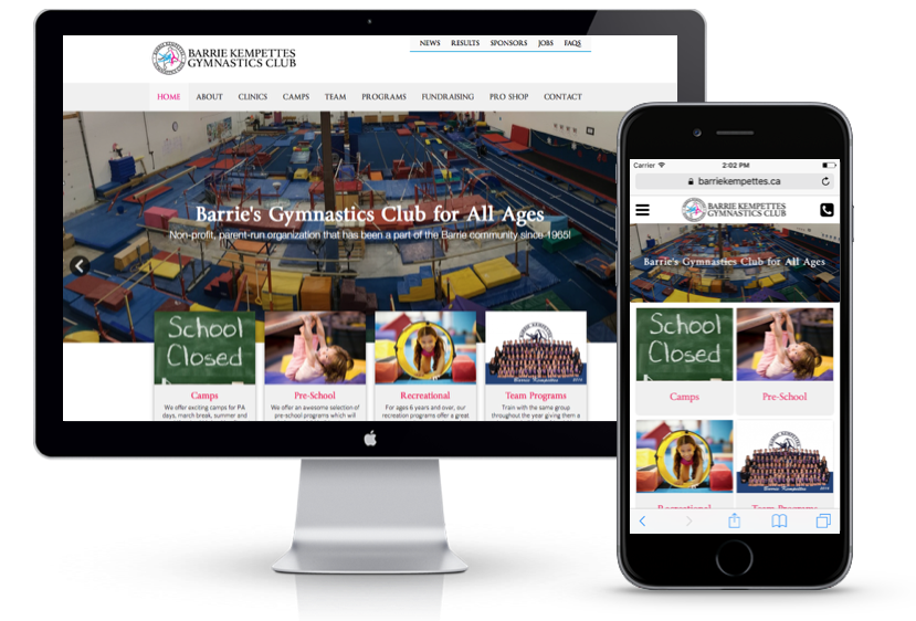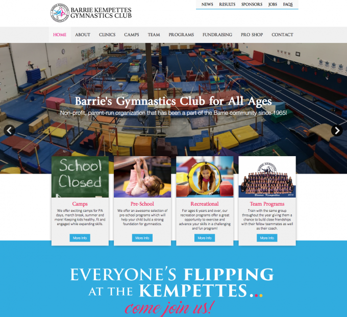 This local gymnastics club is an icon in Barrie, with hundreds of parents accessing the website on a regular basis for programs, results, clinics and more they needed awesome looking website that was made it easy for the staff to update often and easily and extremely easy for parents to find program information, camp dates and registration detail, open gym clinics with registration and so much more! This project required a ton of planning and layout of the huge volume of informatmion and the work paid off.