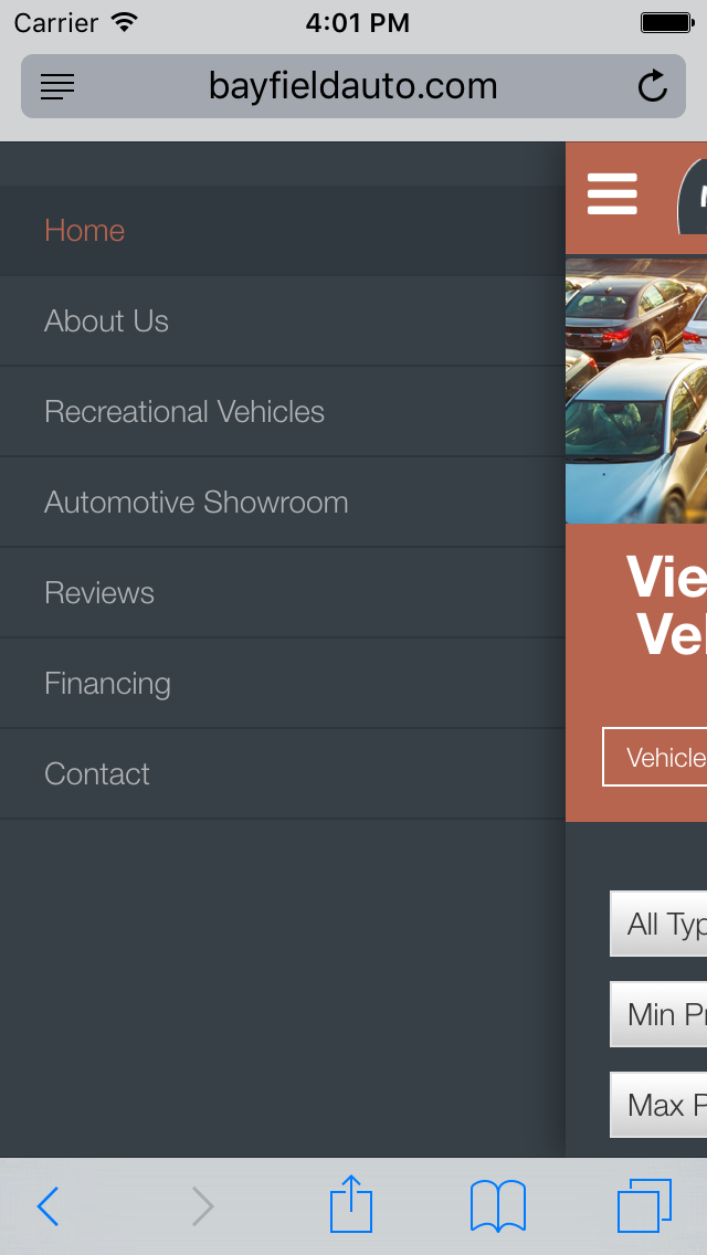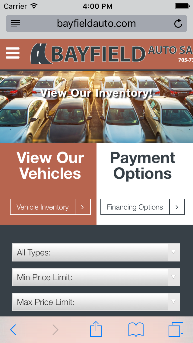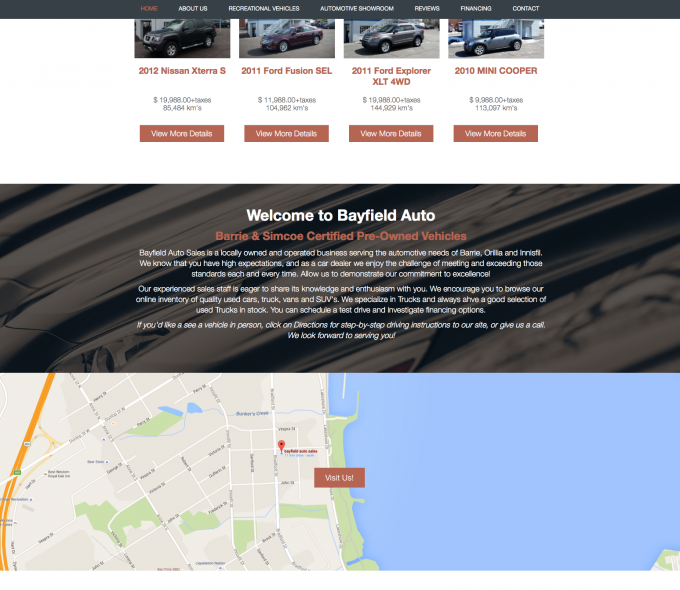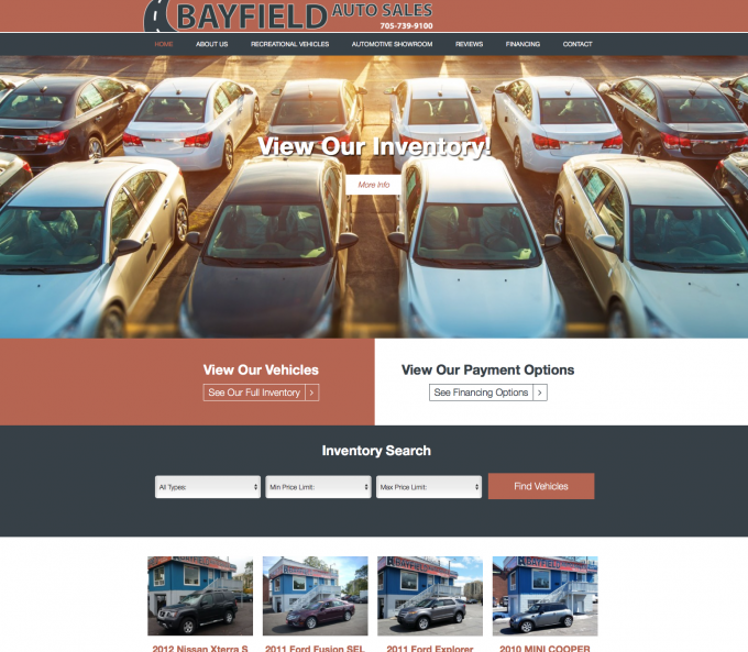 This 2016 redesign put the bayfield site on mobile phones and introduced an convenient filtering function to sort vehicles by type and price range. This awesome design also incorporated the new brand on a timeless stripe layout.