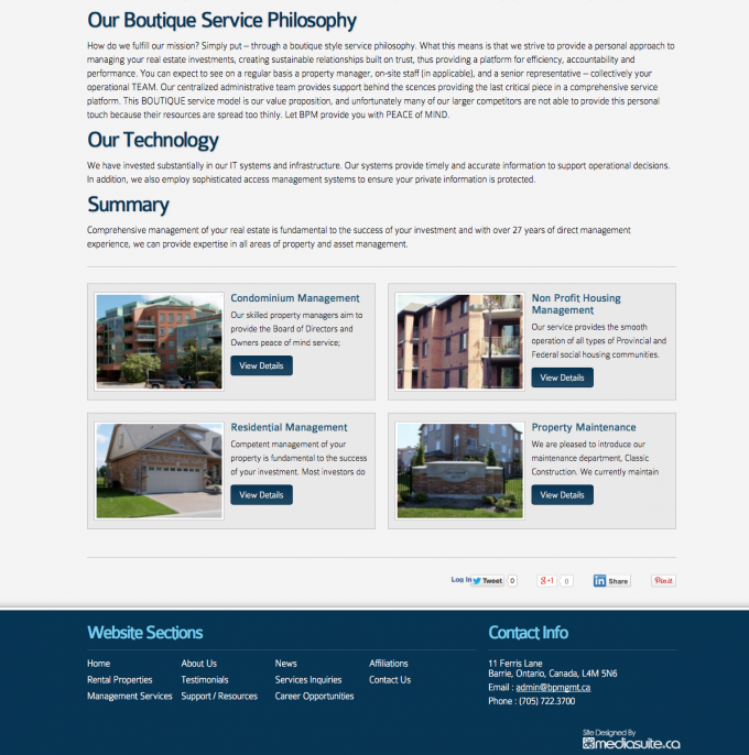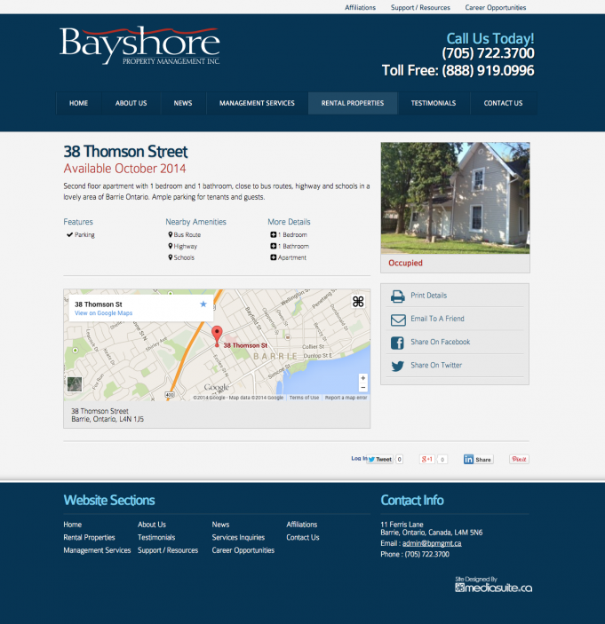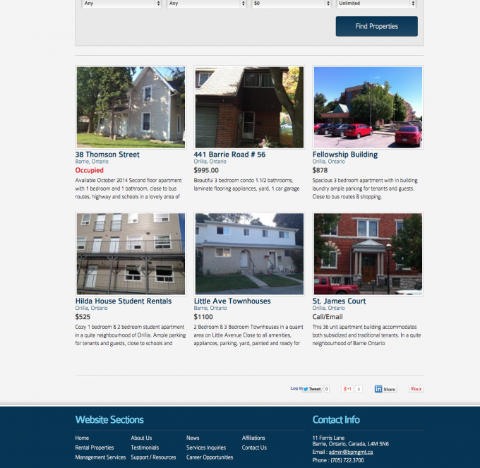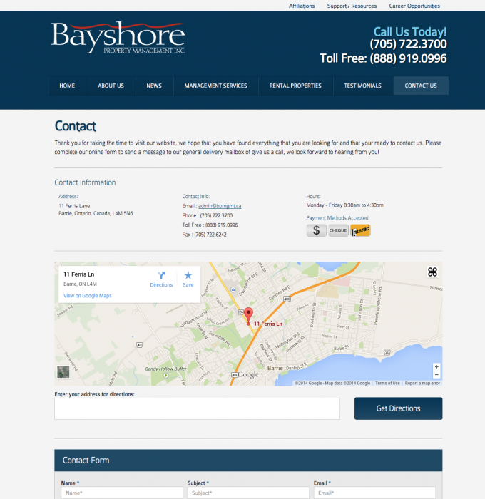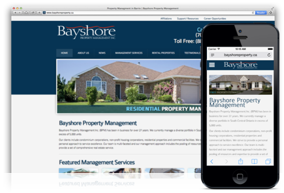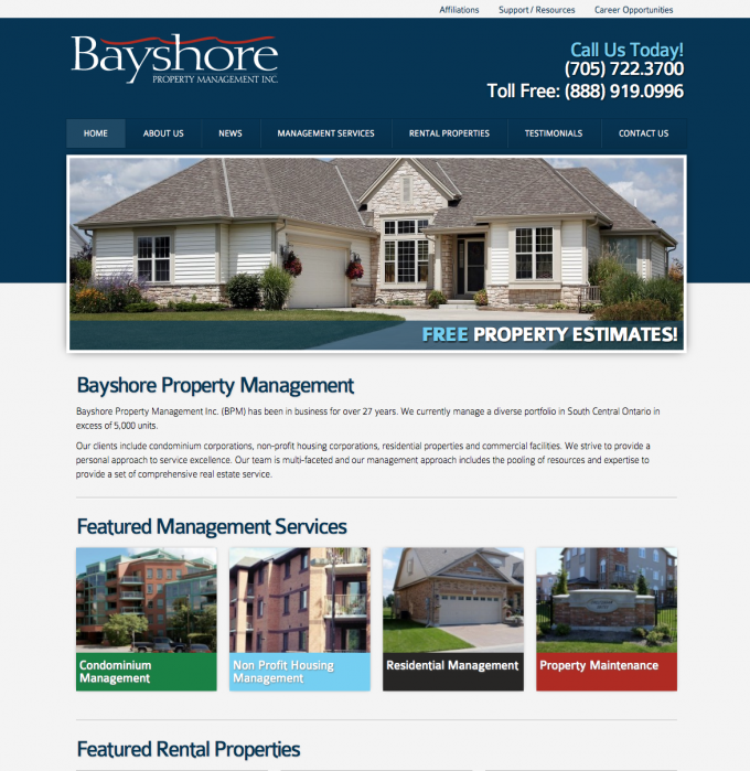 Barrie’s largest property management company Bayshore Property Management came off of a Wordpress platform. They wanted a content management system that was easier to use, saved staff time and guaranteed that the layout of the properties they represented always had a beautiful display and were easily organized and found by their site visitors. We also created custom forms, such as property status request forms and tenant work order requests to facilitate these processes and add convenience to their tenants and agent customers.