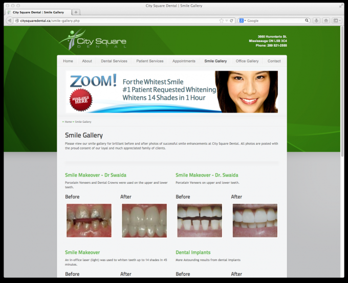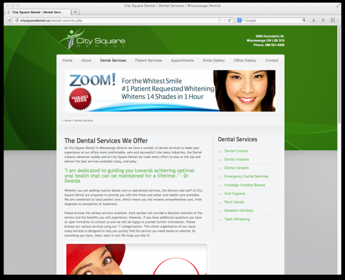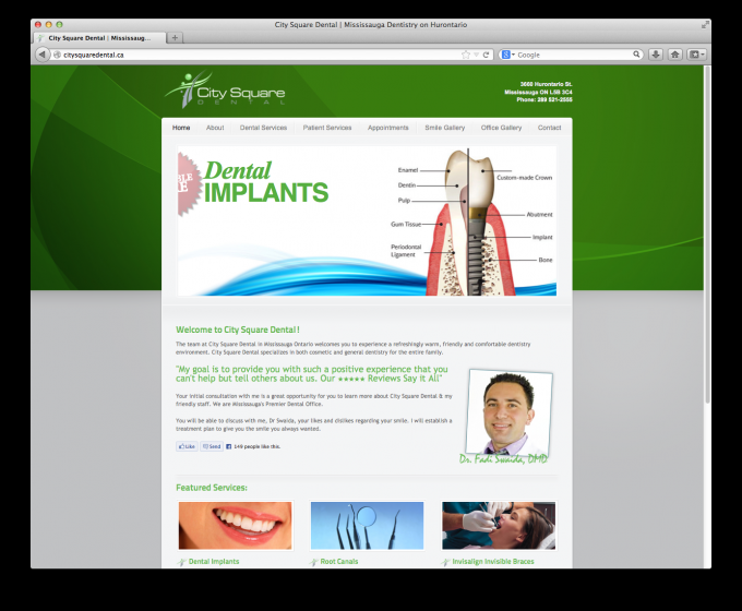 The team at City Square Dental in Mississauga, Ontario, welcomes you to experience a refreshingly warm, friendly, and comfortable dentistry environment. City Square Dental specializes in both cosmetic and general dentistry for the entire family. Your initial consultation with me is a great opportunity for you to learn more about City Square Dental and my friendly staff. We are Mississauga's Premier Dental Office.