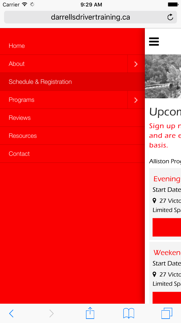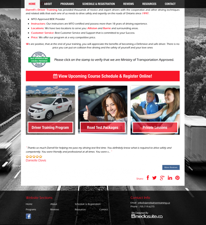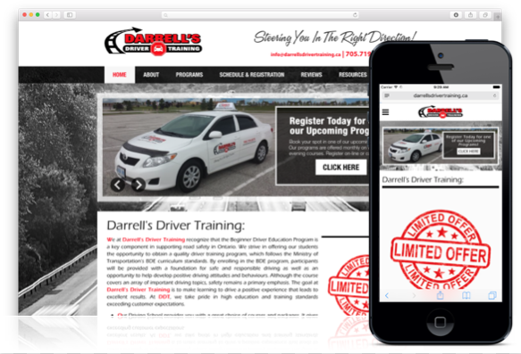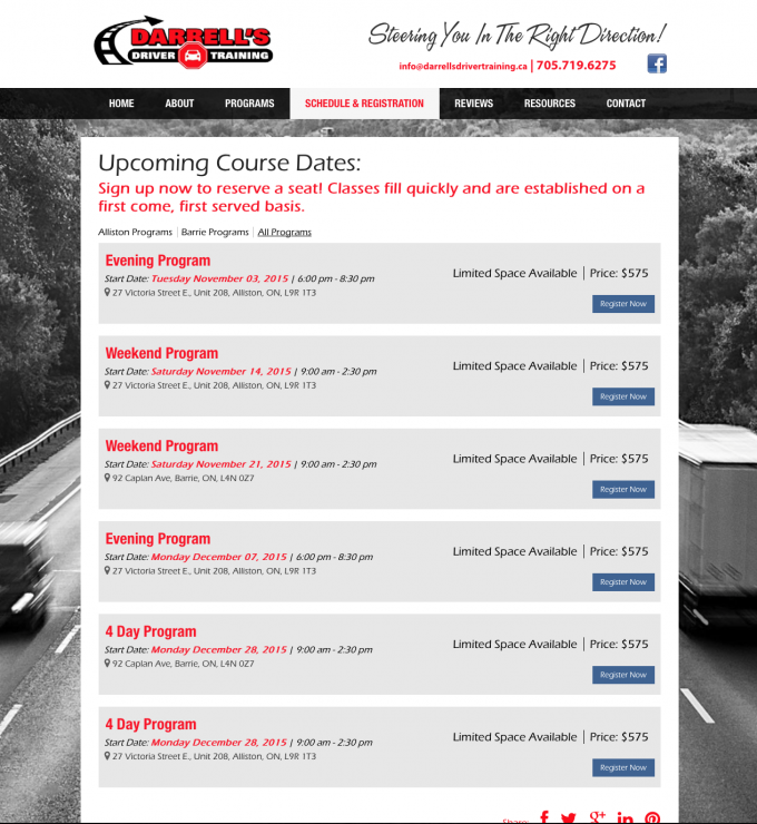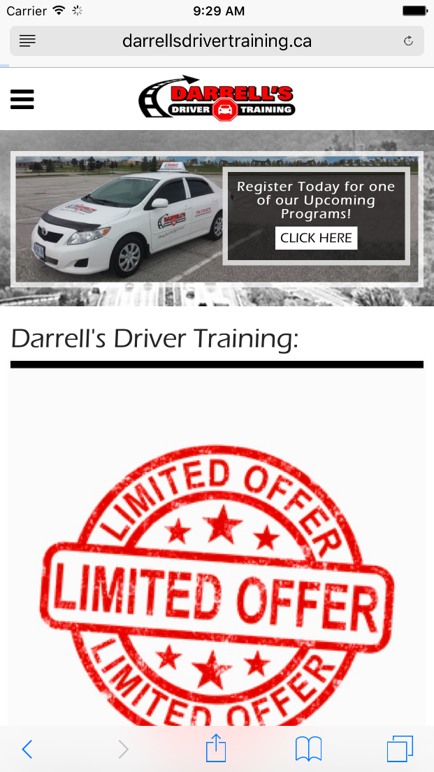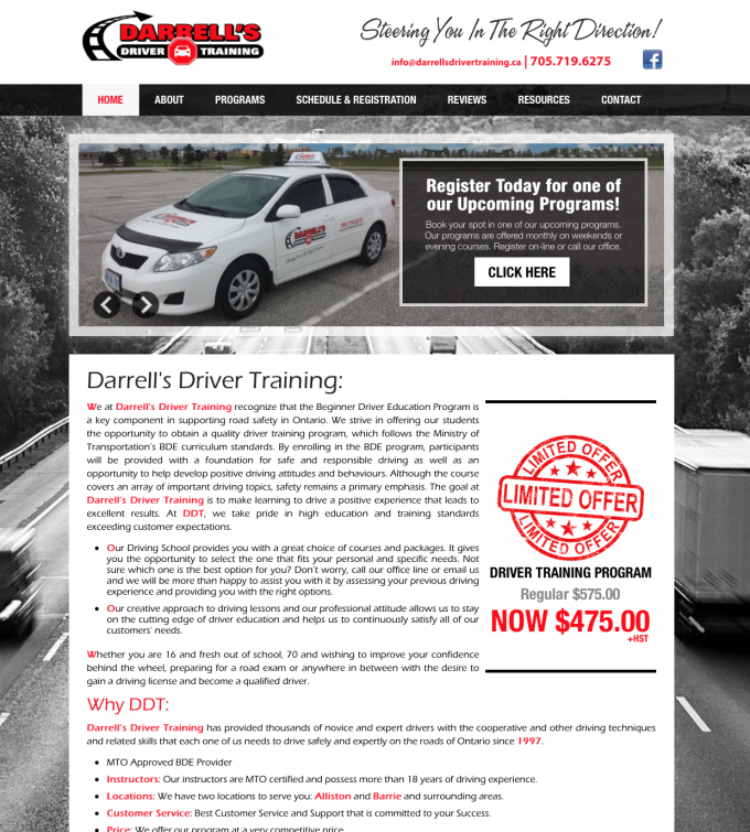 This driver training business really turned up the standards for websites in this industry. This great looking website offers a mobile frienldy version and complete online registration for courses. Now customers can easily see which classes are available at each location and register for a course. Once done Darrell's receives a complete and printable attendee list and the customers get a convenient email to deliver them all they need to know when they arrive.