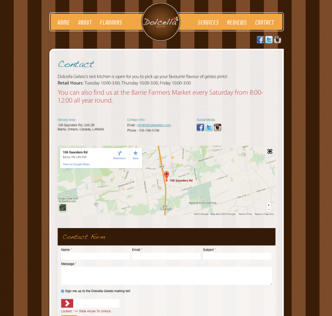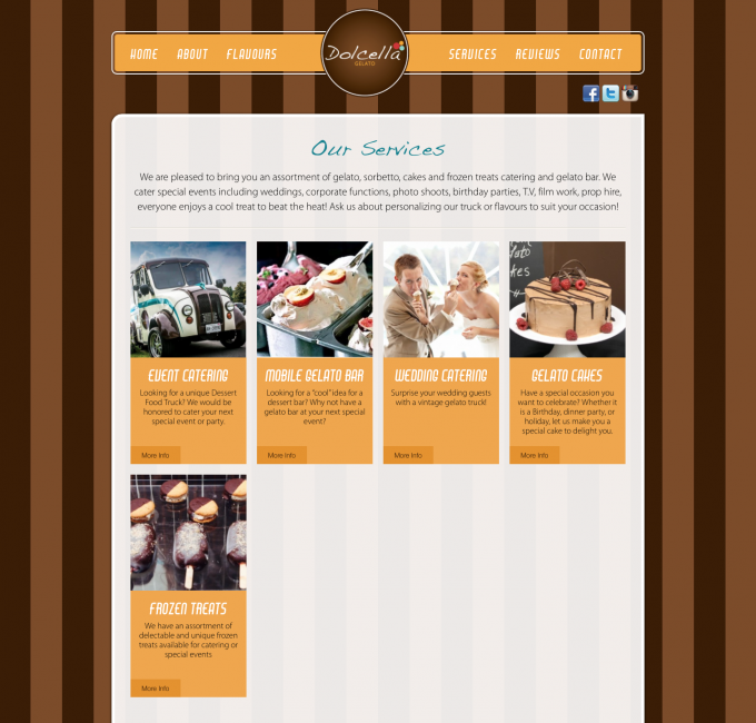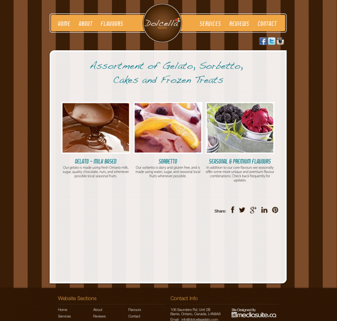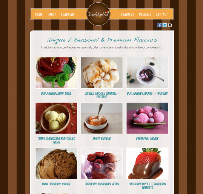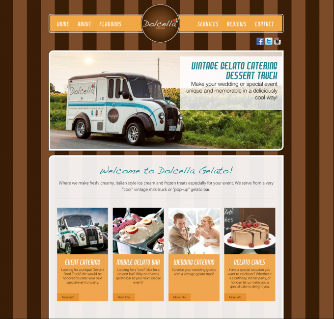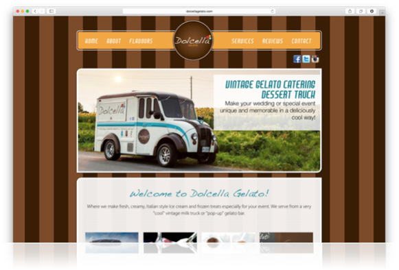 Lisa, from Dolcella Gelato, approached us originally in March 2014 to build her website but the business was too new and she wasn't quite ready to take the leap. After a successful summer she reconnected with us in the winter and Dolcella Gelato marked our first launch for 2015! This website was a lot of fun to build due to the vintage theme and her unique truck. Having a vintage design allowed us to explore some creative ideas and applications such as her “Flavours” section where she can promote the different flavours she offers as part of her dessert catering services.