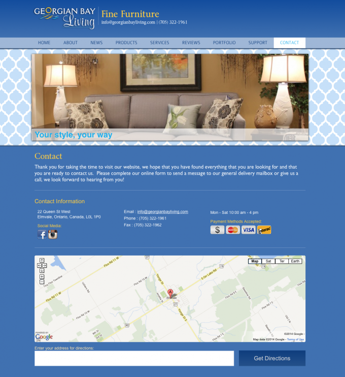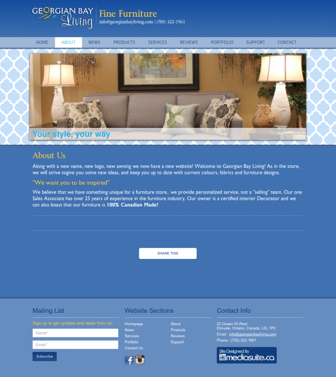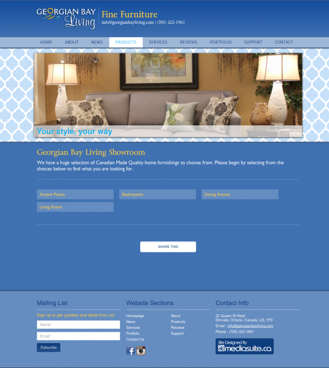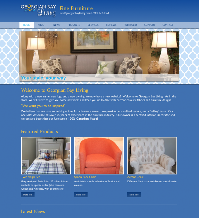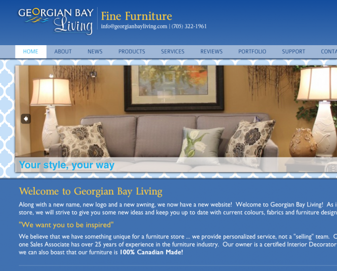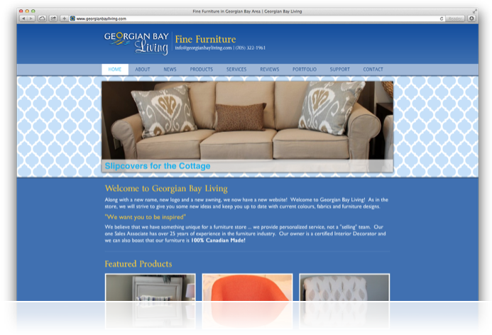 A very clean and classy website with a huge product section. In this site we created product relationships, featured product groups and lots more. The Georgian Bay living website is a very clean blue design, geared to bring attention to the products and not distract users with an abundance of graphical distraction.