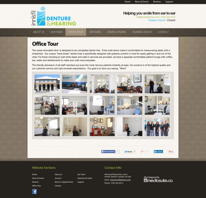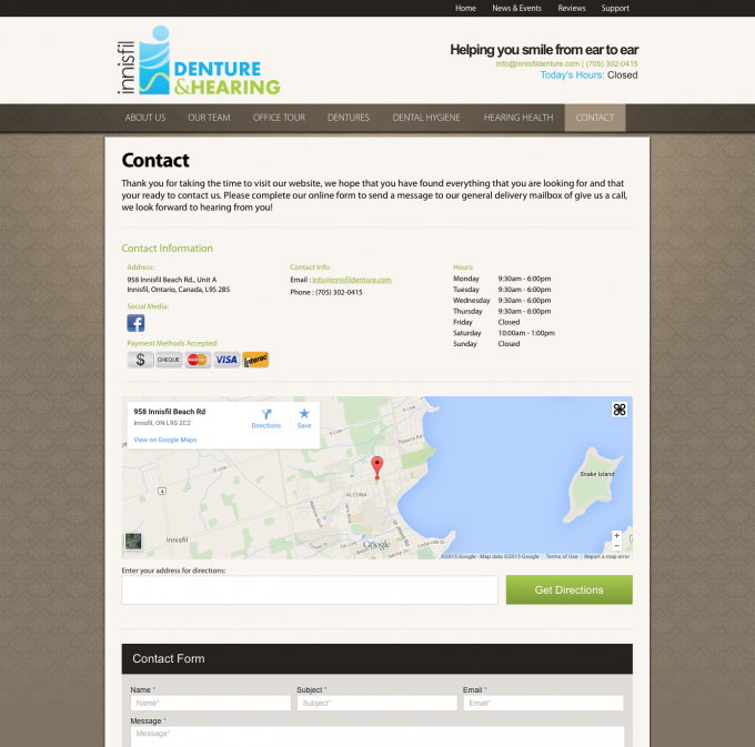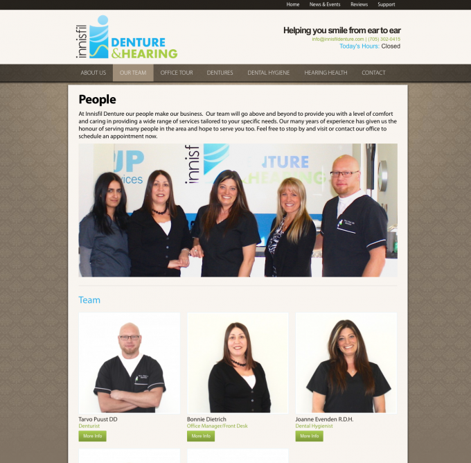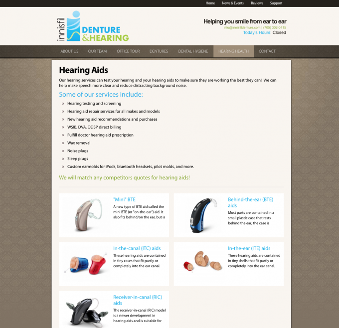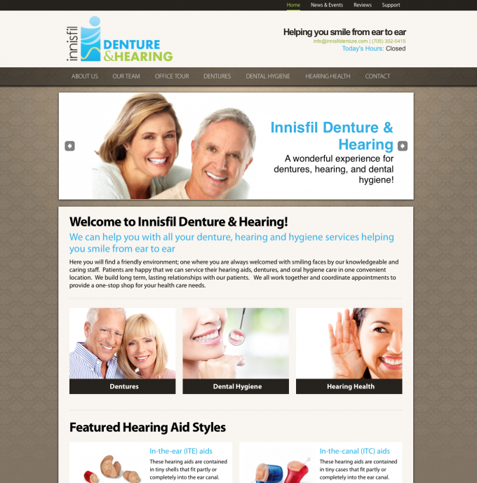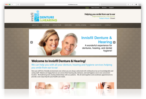 Innisfil Denture has a long standing reputation in town for dental and hearing services. With a resent redesign of their office they felt it was only right to redesign their website as well. After finding us on Google, we met with their team and began working on this great custom website design. This design faced some unique challenges, particularly with colour. While the logo had very cool colours, they wanted a warm feel to match the office. So, we tied together these contrasting colour temperatures nicely and created a modern, yet classic, design that really pops.
