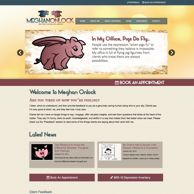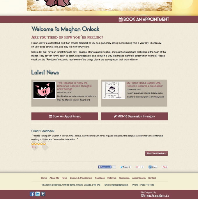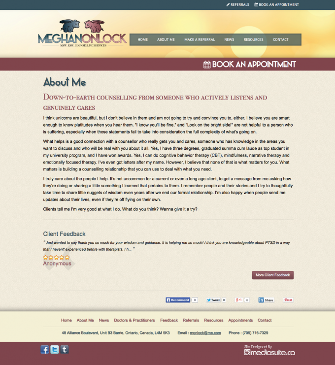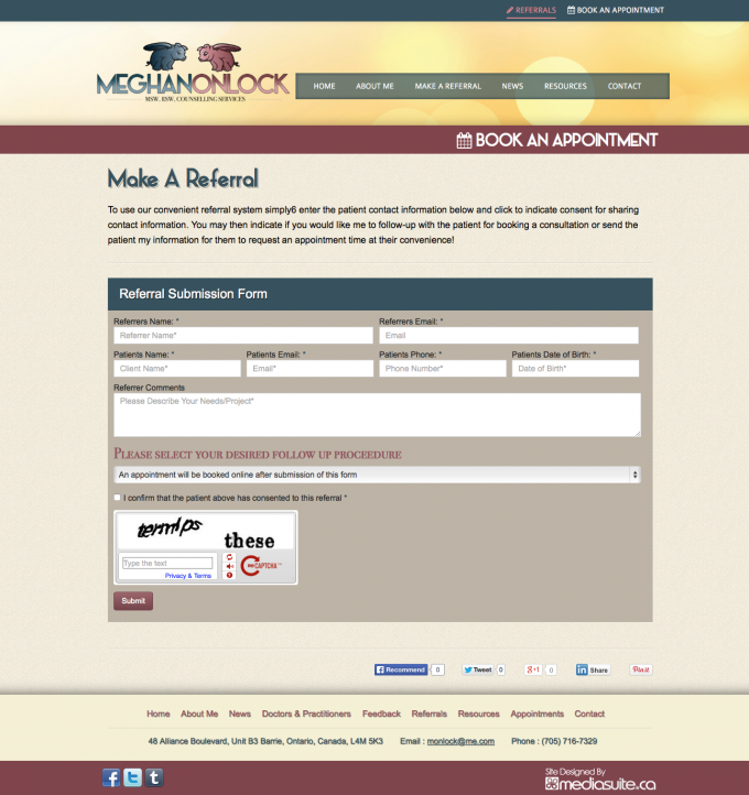 This website, basic at first glance, provides some really cool functions. A Health Canada form that presents visitors with a series of radial questions designed to calculate depression inventory. This is designed to help visitors in the exploritory stage, perhaps, understand why they may be feeling the way they are. Another awesome feature we built into this custom site is the referral system. Here, Physicians, Nurse Practitioners and Lawyers are provided an easy to use form that automatically generates a referral and connects the patient, referrer, and Meghan Onlock in an efficient system, then delivers a real time booking system powered by Full Slate.
