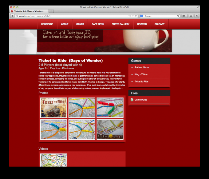 This website showcases a complete collection of the games avaiable at the café, menu information, a complete multi photo gallery, reviews system and contact page.