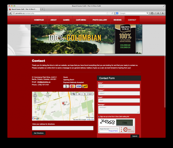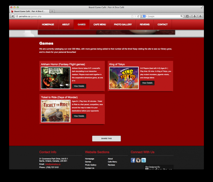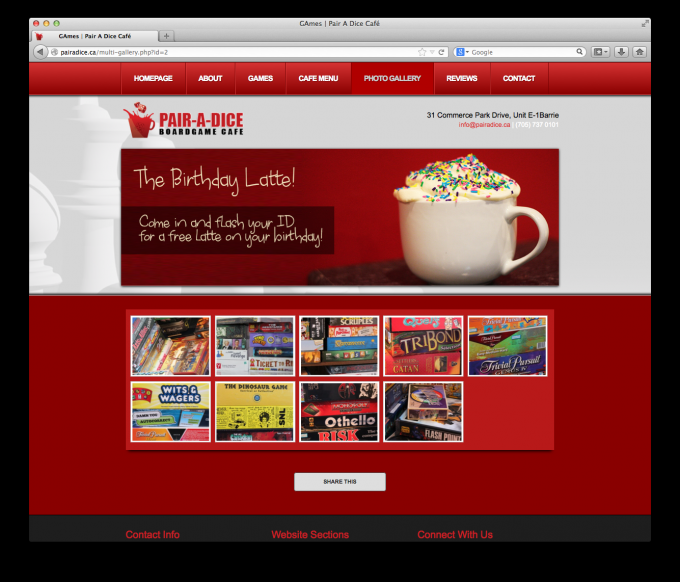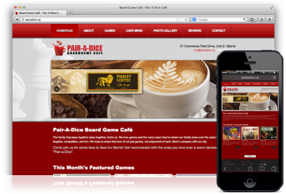 This completely unique business to Barrie is a café where you and friends can sip on a fine latté and play just about any board game you can dream of. Pair A Dice scheduled to open in Nov 2013 and hired us to create their online identity. With all of the costs that come with opening a new business, Pair A Dice needed a great website that would be a strong foundation for future growth, while not breaking the bank, and we delivered!