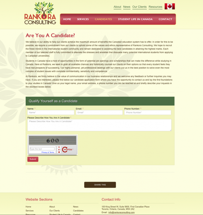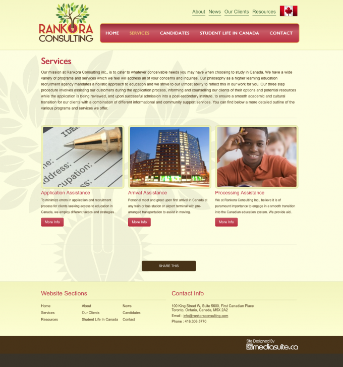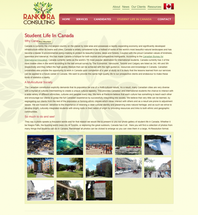 This site provides a very easy to navigate and comfortable layout of information to provide visitors insight on how Rankora can help them transition to Canada and become involved in our amazing education system.