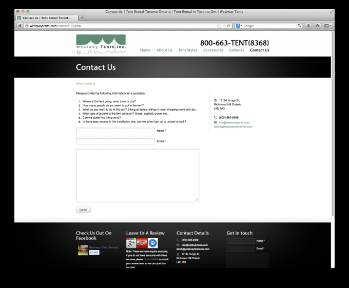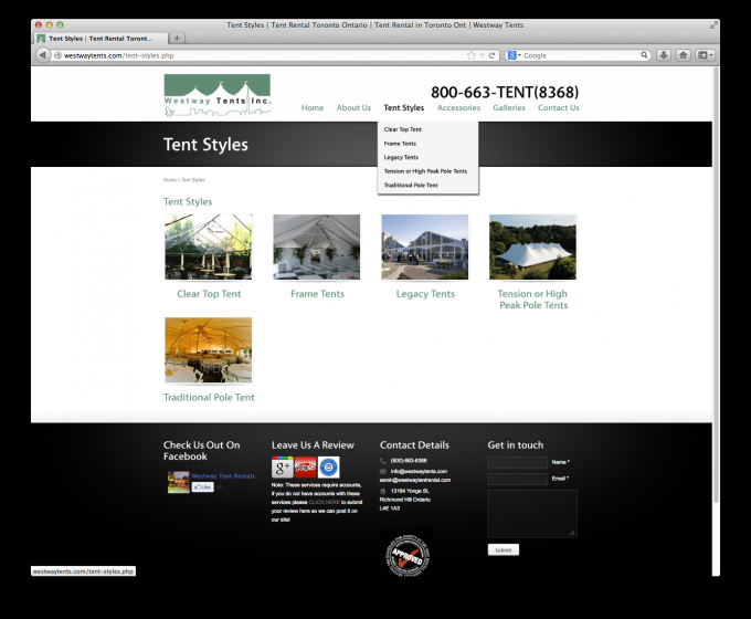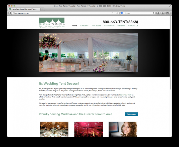 Westway Tents Inc. is a family-run operation that has been in business for the past 10 years. We are proud to provide service to the Greater Toronto Area, as well as Muskoka (cottage country) for all of your rental needs. For tent sales, we service the North American market and guarantee an aggressive price, and fast delivery.