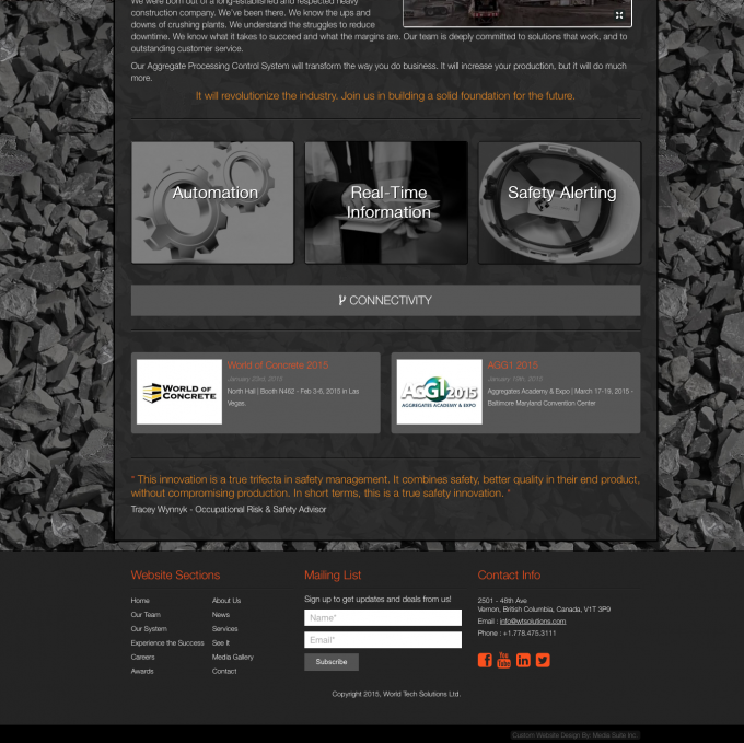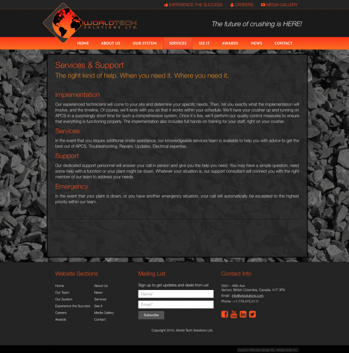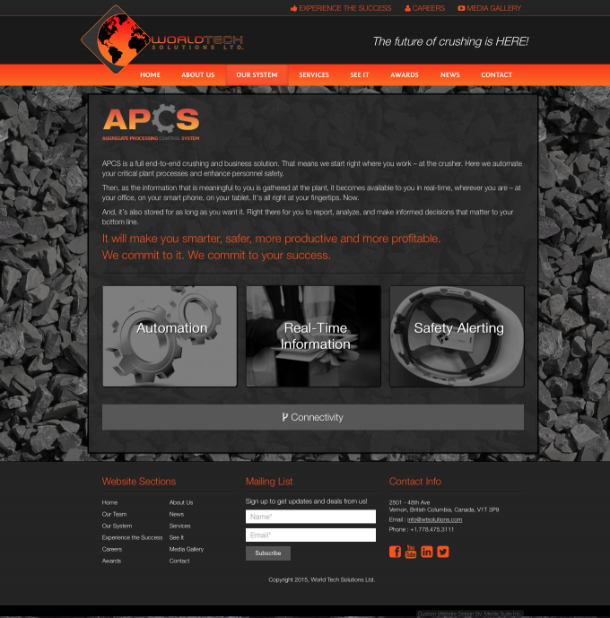 This BC based business found Media Suite in the summer of 2014 via Google and added us to an RFQ list. After a thorough vetting and application process we were awarded the contract and began development in winter of 2015. This site launched in one month under a lot of pressure to meet the deadlines for trade shows. We delivered a very easy to update site with an awesome parallax background animation and a complete mobile version.