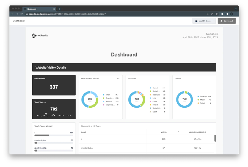 Total Visitors Total New Visitors Pages most frequently visited How visitors are finding you Where your visitors are located What devices they are using How much time visitors are spending on each page