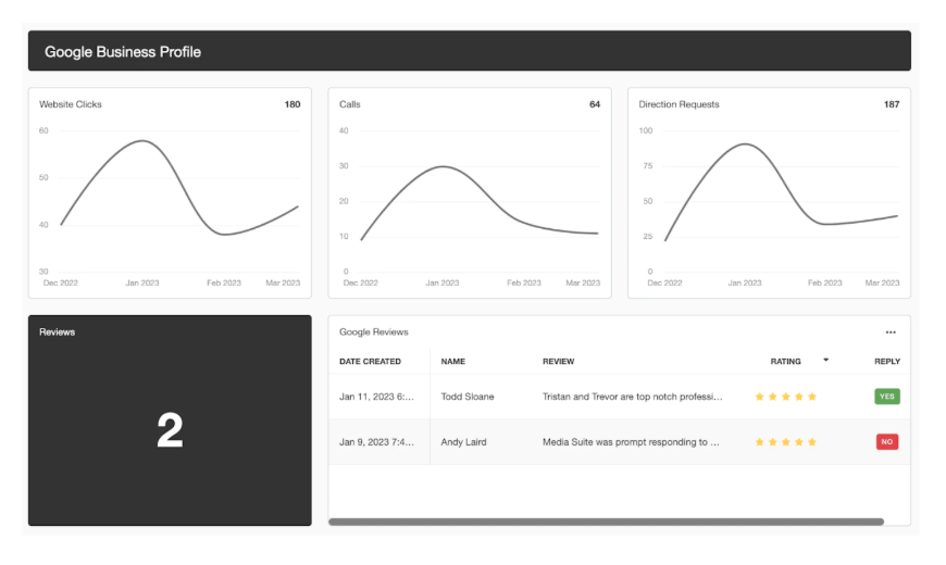 Listing Total number of website visits from your GMB listing Total number of calls from your GMB listing Total number of direct requests from Google Maps Consolidated Google Business reviews with reply status