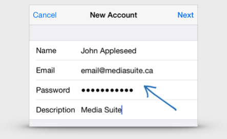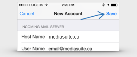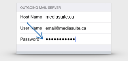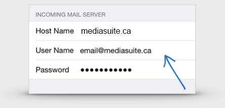 Under "Host Name" type mediasuite.ca, Username your entire email address and password is the password provided by Media Suite. Note: Be very careful to get every character correct, a single charactor or case sensitive error will cause a problem with connection to your email.